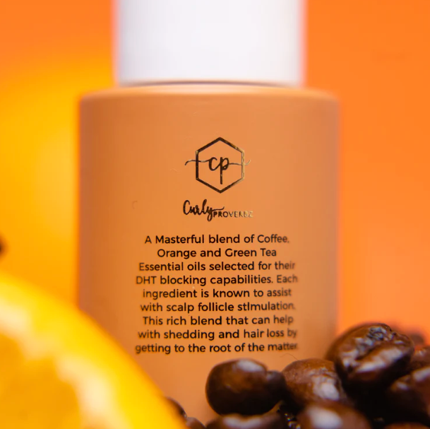 A Masterful blend of Coffee, Orange and Green Tea Essential oils selected for their DHT blocking capabilities. Each ingredient is known to assist with scalp follicle stimulation. This rich blend that can help with shedding and hair loss by getting to the root of the matter.